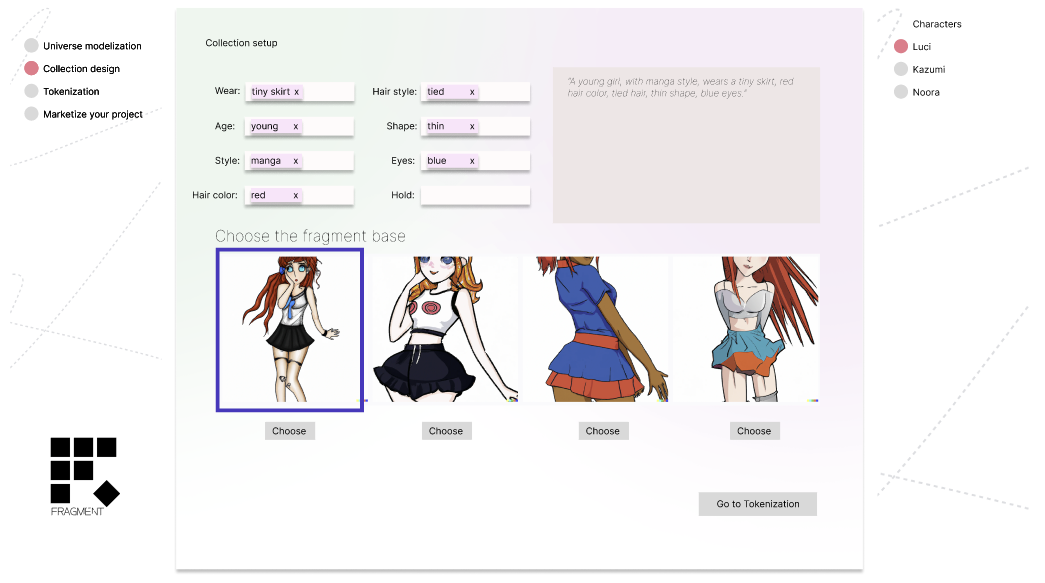 Once the **Universe modelization** (step 1) is done, our technology has created many *non-tokenized fragments* that represents all the content of your work (characters, places, objects, immaterials).