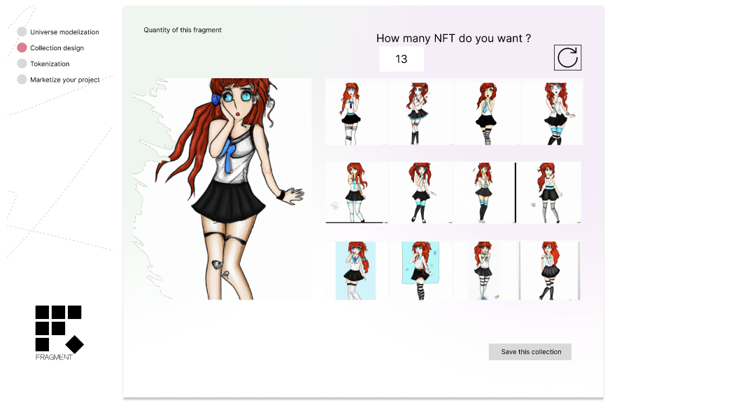 Once the base visual of the fragment is chosen by you, the program will propose as many variations as you want in order to complete the collection.